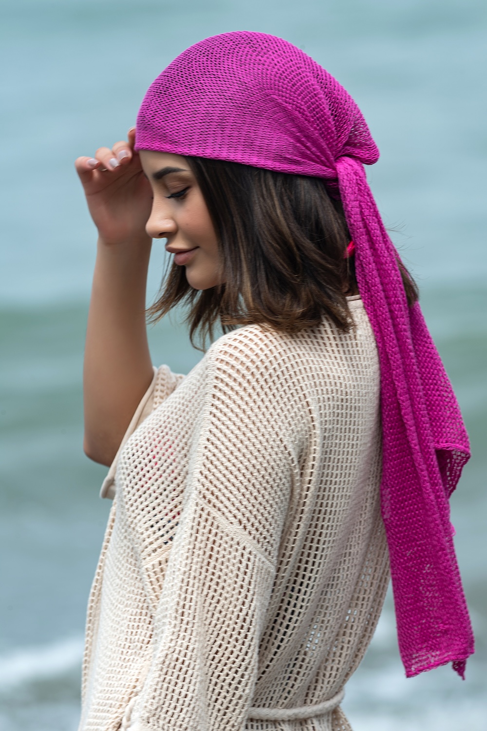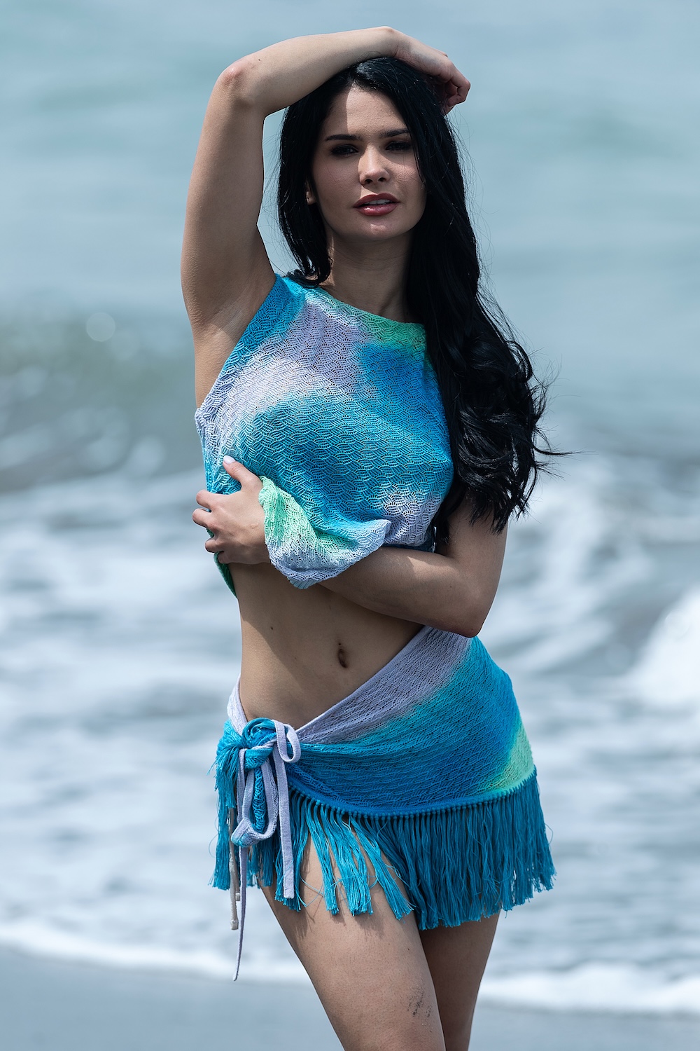 Crafted entirely in 100% Peruvian pima cotton, this collection merges ancestral hand-knitting and machine techniques with artisanal dyeing processes that transform each garment into a unique, one-of-a-kind piece. Organic cutouts breathe like the sea, creating transparencies that allow perfect ventilation for summer days. Color gradients evoke sunsets over water, while open stitches mimic the living structure of coral.